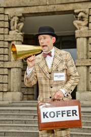 Herr Gorges macht im Lauf der Veranstaltung gerne auch kleine Kabaretteinlagen. Manchmal bleibt der Koffer die ganze Veranstaltung geschlossen.